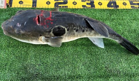 今日はトラフグ釣り!流れが速く釣りにくいなかなんとかカオが見れました。