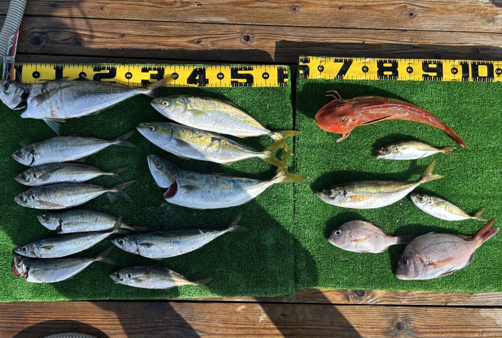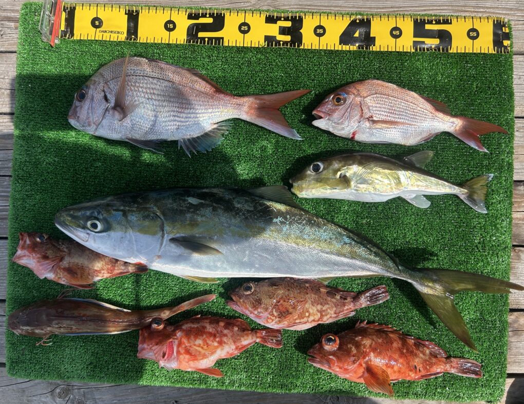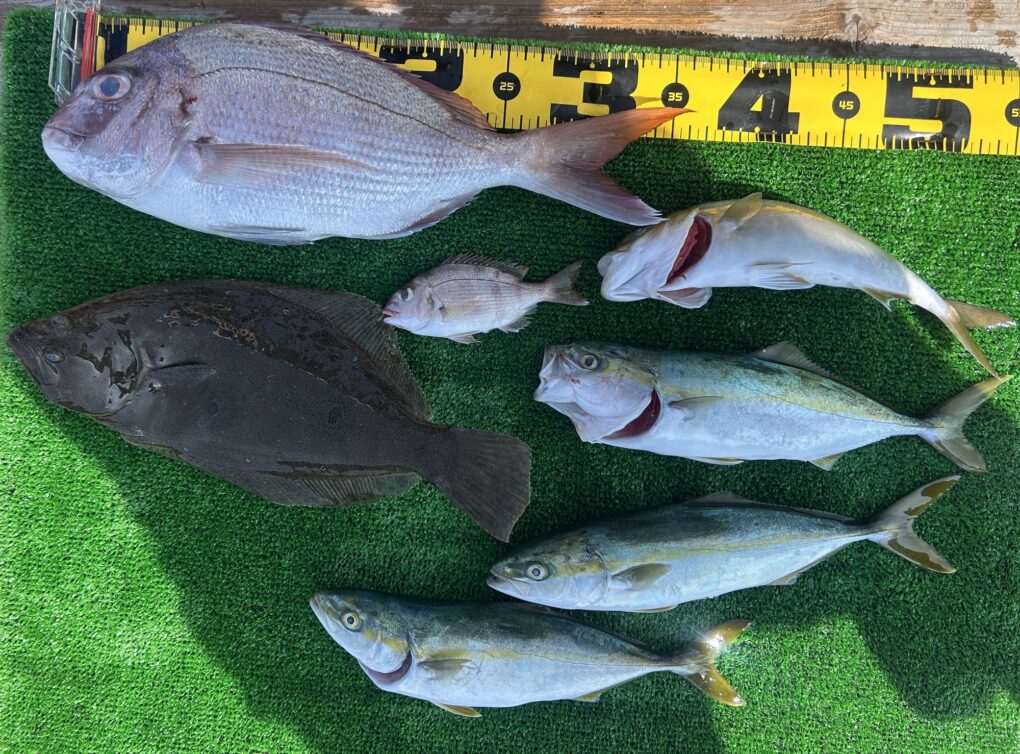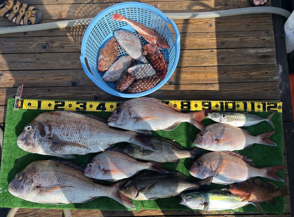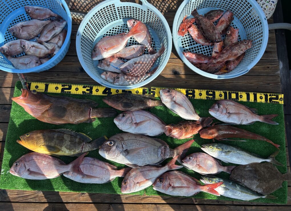 今日は釣れすぎ〜🙌マダイは70をアタマにボコボコに釣れました。ハタにホウボウ、デカトラフグ,アジなどいっぱいです。